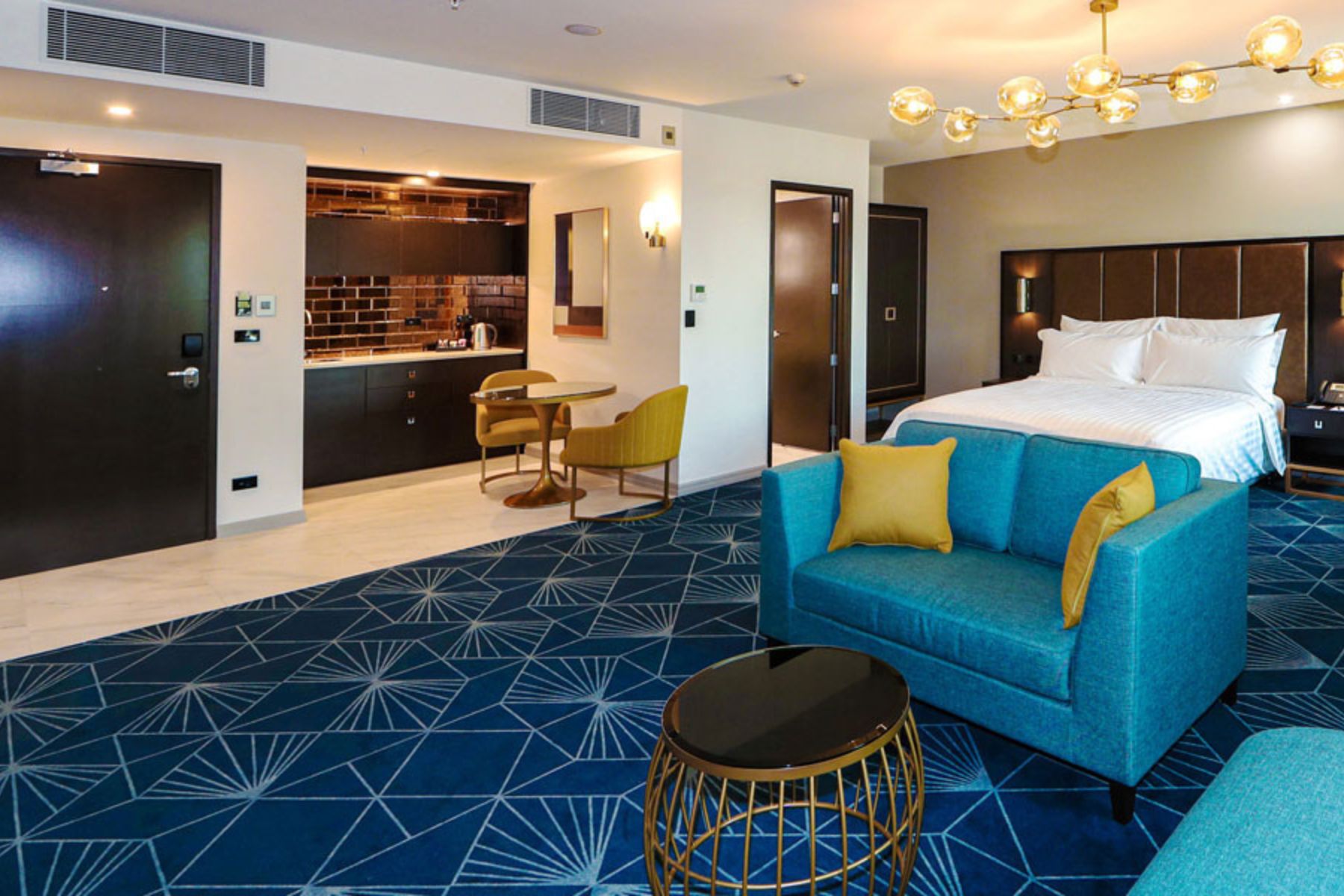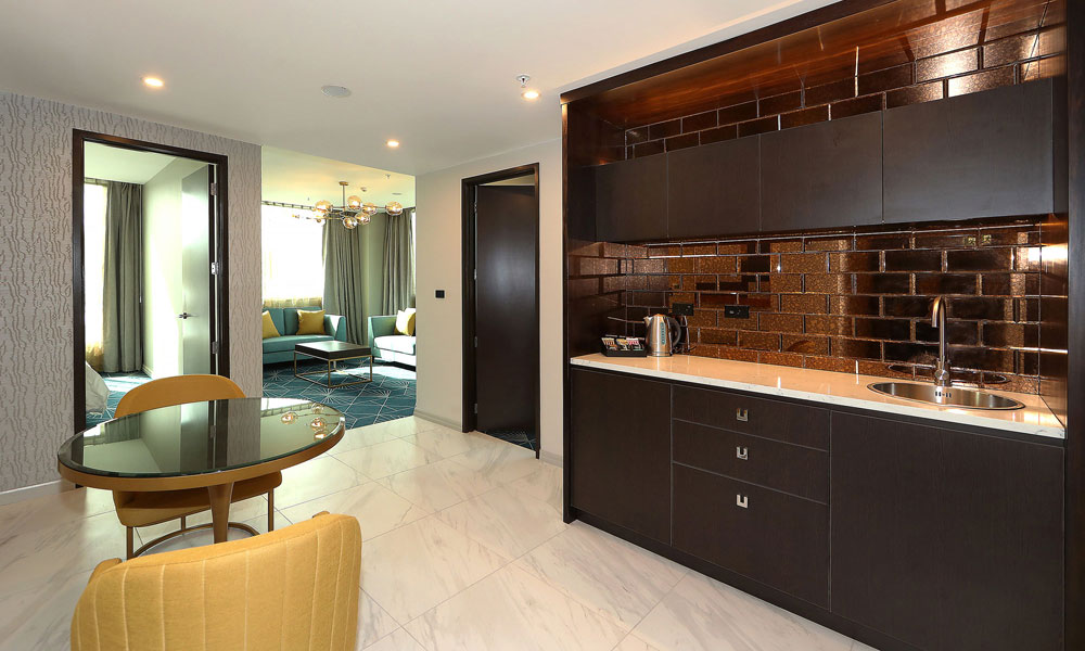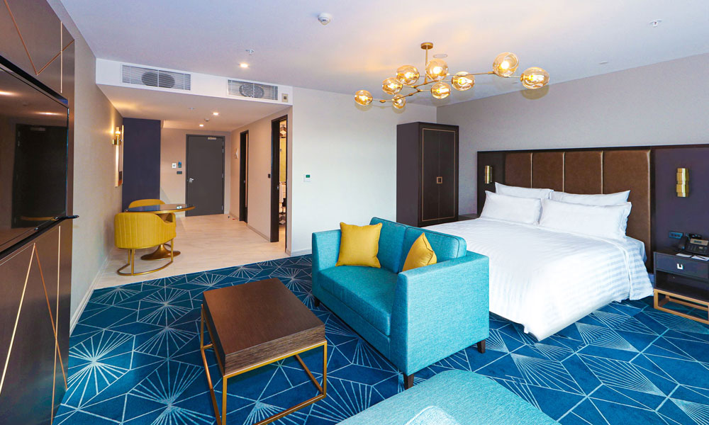 Your Deluxe Studio is spacious in size with 56 sqm (603 sq ft). The perfect room for families, friends and couples as the studio features a bedroom with king size bed and a separate bedroom with a queen bed. Oversized windows provide great natural daylight and the room provides the latest Philips 50″ Smart TV and complimentary unlimited high speed WiFi internet.