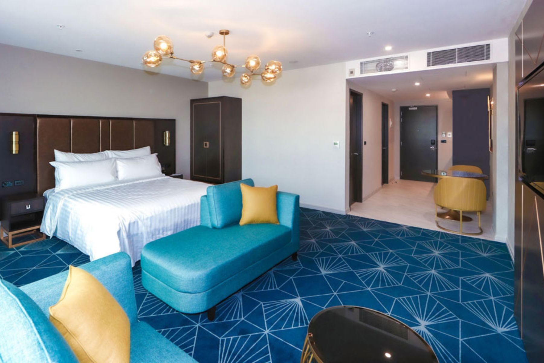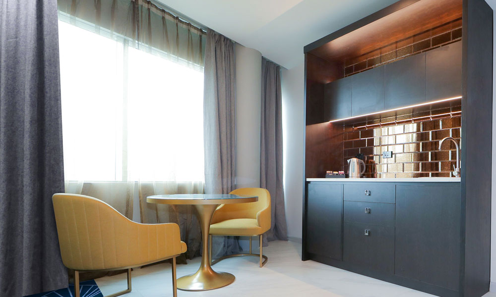 Your Executive Studio is spacious in size with 39 sqm (419 sq ft). Oversized windows provide great natural daylight. Featuring a king size bed, the room comes with the latest Philips 50″ Smart TV and complimentary unlimited high speed WiFi internet.